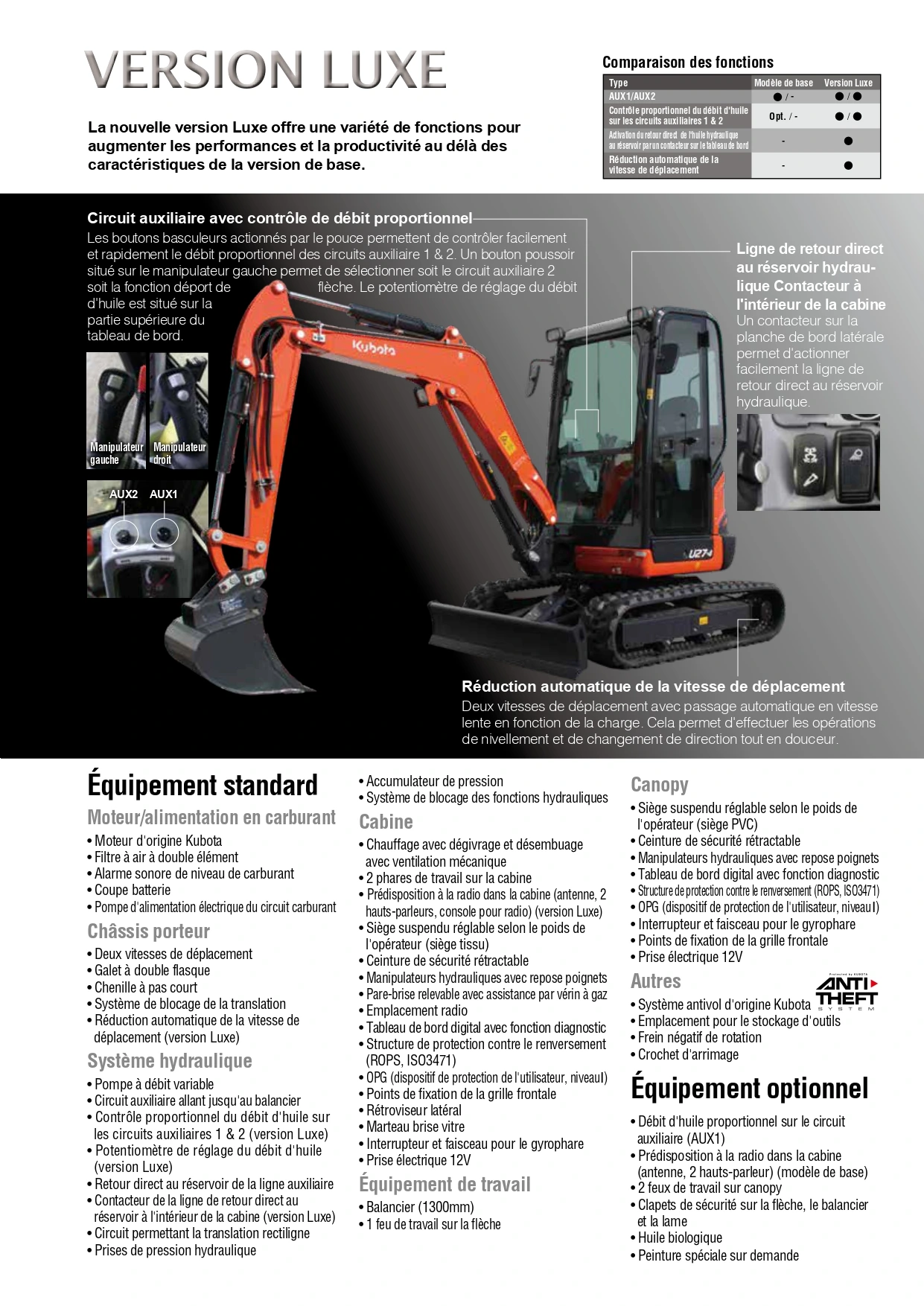 La fiche détaille les configurations possibles : version cabine / canopy, circuits auxiliaires (AUX1 & AUX2), clapets de sécurité, gyrophare, feux de travail et diverses options hydrauliques. La version Luxe offre davantage de confort et d’assistance au pilotage.