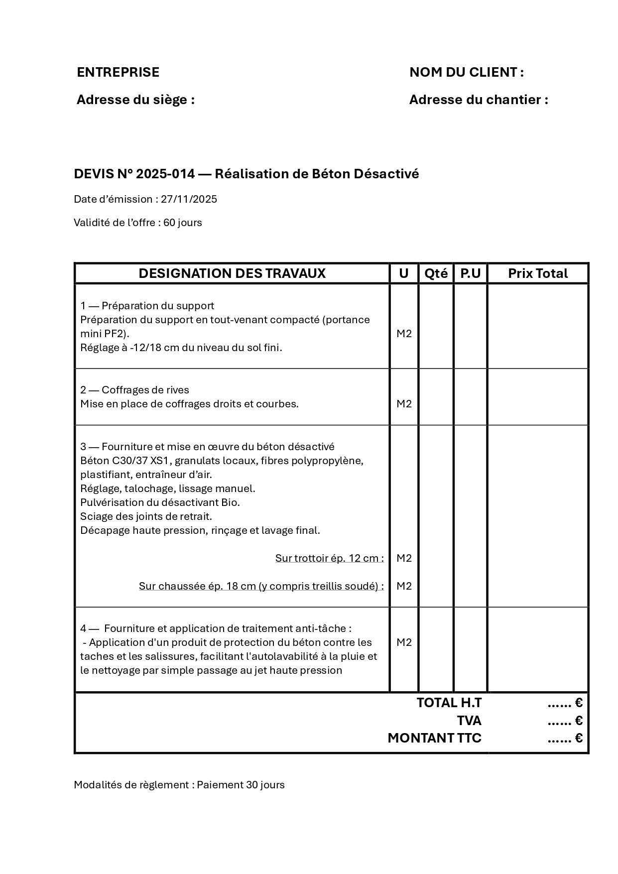 Vous trouverez ci-dessous un exemple complet de devis pour la réalisation d un béton désactivé, incluant tous les postes essentiels ainsi que les prix indicatifs au mètre carré.